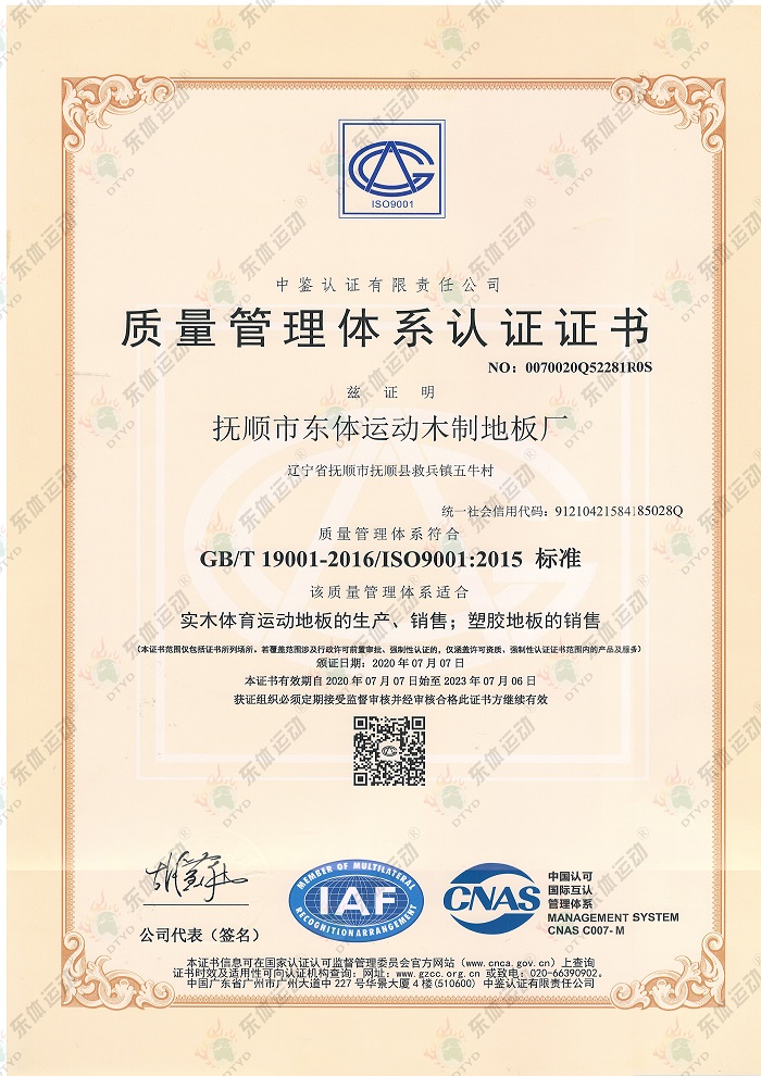 “東體運動”木地板系列產品已經通過國際籃聯檢測、世界羽聯認證、歐盟體育地板專項標準CE認證、歐盟環保產品CE認證、FSC世界森林協會認證、五星級售后服務企業認證等,是中國職業籃球俱樂部遼寧沈陽三生飛豹籃球俱樂部官方合作伙伴,內蒙古籃球協會戰略合作伙伴。